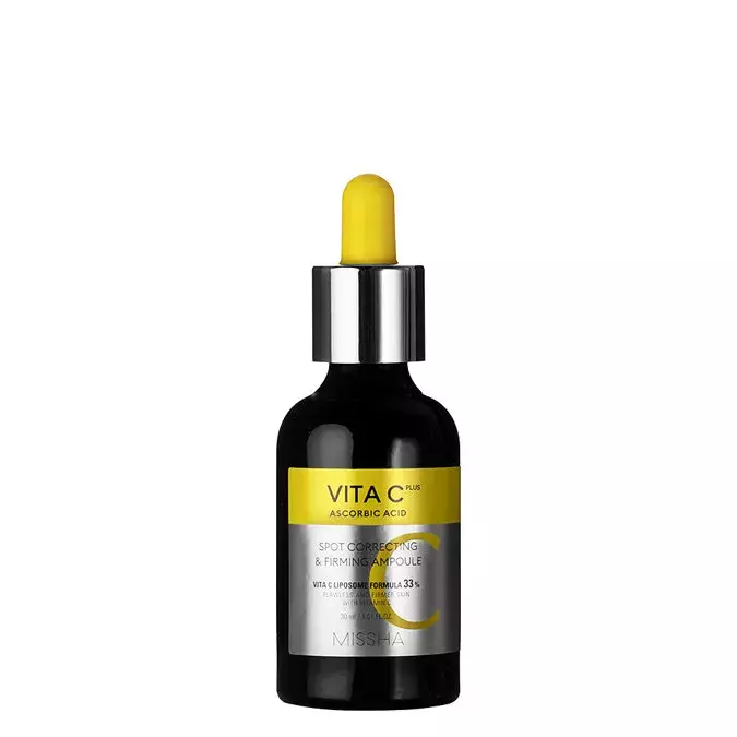 Missha - Vita C Plus Spot Correcting & Firming Ampule - serum o działaniu intensywnie rozjaśniającym, skomponowane na bazie przeciwzapalnego ekstraktu z korzenia lukrecji. Skutecznie rozjaśnia dzięki zawartości witaminy C oraz hydrolatu rokitnikowego, który jest tej witaminy naturalnym źródłem. Efektywnym rozjaśniającym składnikiem jest też kwas traneksamowy. Zawartość niacynamidu zapewnia wyrównanie kolorytu skóry. Poza rozjaśnianiem przebarwień, które natrafiają się skórze w każdym wieku, serum jest odpowiednim kosmetykiem także dla cery dojrzałej dzięki zawartości Ceramid NP, peptydów, adenozyny oraz antyoksydatów.
