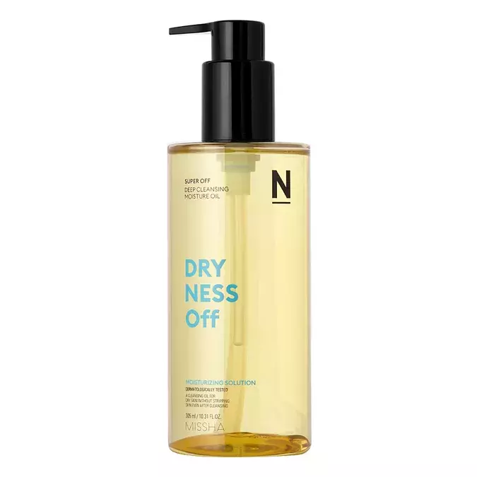 Missha - Super Off Cleansing Oil - Dryness Off - olejek do oczyszczania skóry twarzy, przeznaczony dla cer suchych. Idealnie sprawdza się do pierwszego etapu oczyszczania. Bazuje na olejach: ze słonecznika, ze słodkich migdałów oraz arganowym. Oleje te doskonale zmiękczają i wygładzają skórę, poprawiają jej elastyczność, a także rozpuszczają pozostałości makijażu i zanieczyszczenia. Masło shea zapobiega utracie wody z naskórka, chroni przed przesuszeniem i łagodzi podrażnienia.