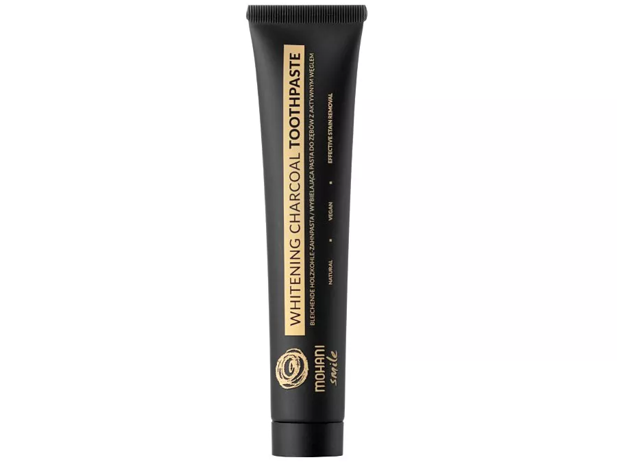Mohani - Whitening Charcoal Tootpaste - Wybielająca Pasta do Zębów z Aktywnym Węglem - wybielająca pasta do zębów. Zawiera aktywny węgiel, który rozjaśnia powierzchnię zębów, przywracając im naturalną biel i połysk, a stewia dba o zdrowie dziąseł. Obecny w produkcie ksylitol działa przeciwpróchniczo, a kompozycja olejków eterycznych działa przeciwbakteryjnie. Pasta naturalnie wybiela i działa antybakteryjnie. Produkt nie zawiera fluoru, cukru, ani SLS.