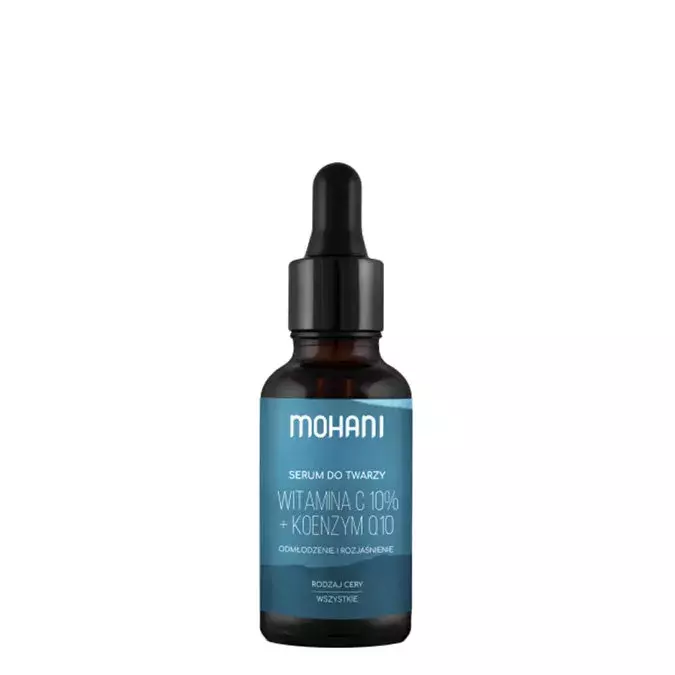Mohani - Odmładzająco - Rozjaśniające Serum do Twarzy z Witaminą C 10% i Koenzymem Q10 - bogate w przeciwstarzeniowe składniki aktywne serum do codziennej pielęgnacji. Zawarty w nim kompleks olejów zmiękcza skórę i wzmacnia jej barierę ochronną, a koenzym Q10 neutralizuje wolne rodniki, zapobiegając w ten sposób szybkiemu starzeniu się skóry. Stabilna forma witaminy C skutecznie rozjaśnia i redukuje przebarwienia i zaczerwienienia. Produkt posiada przyjemny, cytrusowy zapach. Receptura została skomponowana z surowców pochodzenia naturalnego oraz jest wegańska.