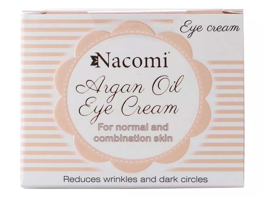 Nacomi - Naturalny Arganowy Krem pod Oczy - zawiera olej arganowy o właściwościach ochronnych, antyoksydacyjnych i przeciwstarzeniowych, masło shea i olej kokosowy, które odżywiają i chronią naskórek przed przesuszeniem oraz wzmacniający barierę hydrolipidową skóry olej z pestek winogron. Dodatkowo pantenol nawilża i niweluje podrażnienia, a witamina E zwalcza wolne rodniki i działa przeciwstarzeniowo. Krem poprawia elastyczność skóry pod oczami, sprawia, że jest miękka, gładka i nawilżona. Cała receptura została opracowana na bazie surowców pochodzenia naturalnego.