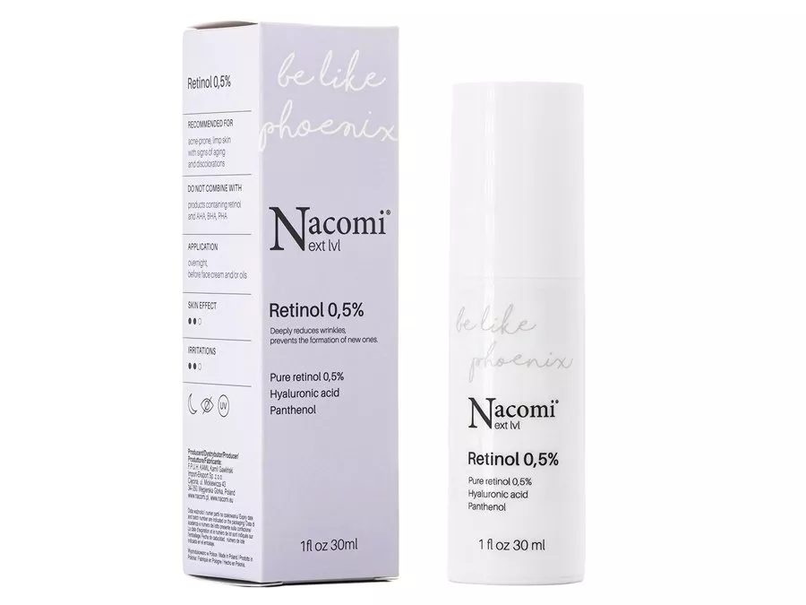 Nacomi - Next Level - Retinol 0,5% - Serum z Retinolem 0,5% - serum z 0,5% witaminą A w formie retinolu. Składnik ten znany jest ze swoich właściwości silnie przeciwstarzeniowych. Retinol posiada zdolności pobudzania fibroblastów do produkcji kolagenu, co skutkuje zwiększeniem jędrności skóry i wygładzenia zmarszczek. Stanowi wsparcie w walce z trądzikiem oraz reguluje ilość wydzielanego sebum. Dodatek czterech form kwasu hialuronowego o różnych rozmiarach zapewnia odpowiedni poziom nawilżenia, a pantenol koi i łagodzi podrażniony naskórek, zmniejszając potencjał drażniący retinolu. Serum wygładza skórę, działa przeciwstarzeniowo, a także łagodzi objawy trądziku. Opakowanie typu air less ułatwia odpowiedniej ilości produktu. Cała receptura została skomponowana z surowców pochodzenia naturalnego.