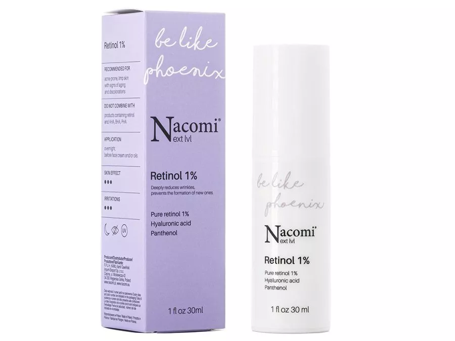 Nacomi - Next Level - Retinol 1% - Serum z Retinolem 1% - serum z 1% witaminą A w formie retinolu. Składnik ten znany jest ze swoich właściwości silnie przeciwstarzeniowych. Retinol posiada zdolności pobudzania fibroblastów do produkcji kolagenu, co skutkuje zwiększeniem jędrności skóry i wygładzenia zmarszczek. Stanowi wsparcie w walce z trądzikiem oraz reguluje ilość wydzielanego sebum. Dodatek czterech form kwasu hialuronowego o różnych rozmiarach zapewnia odpowiedni poziom nawilżenia, a pantenol koi i łagodzi podrażniony naskórek, zmniejszając potencjał drażniący retinolu. Serum wygładza skórę, działa przeciwstarzeniowo, a także łagodzi objawy trądziku. Opakowanie typu air less ułatwia odpowiedniej ilości produktu. Cała receptura składa się z surowców pochodzenia naturalnego.
