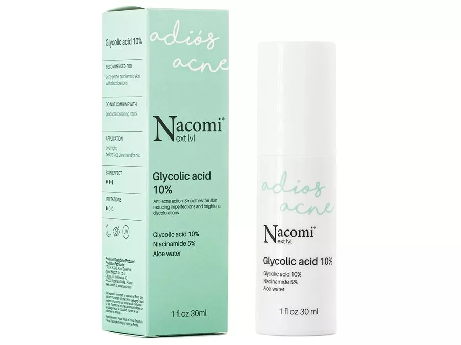 Nacomi - Next Level - Glycolic Acid 10% - Serum z Kwasem Glikolowym 10% - w swoim składzie zawiera kwas glikolowy działający keratolitycznie, regulująco na pracę gruczołów łojowych i rozjaśniająco na przebarwienia. Ponadto sok aloesowy koi i nawilża, a sok z brzozy łagodzi podrażnienia oraz działa antyseptycznie. Cała receptura została opracowana na bazie surowców pochodzenia naturalnego.