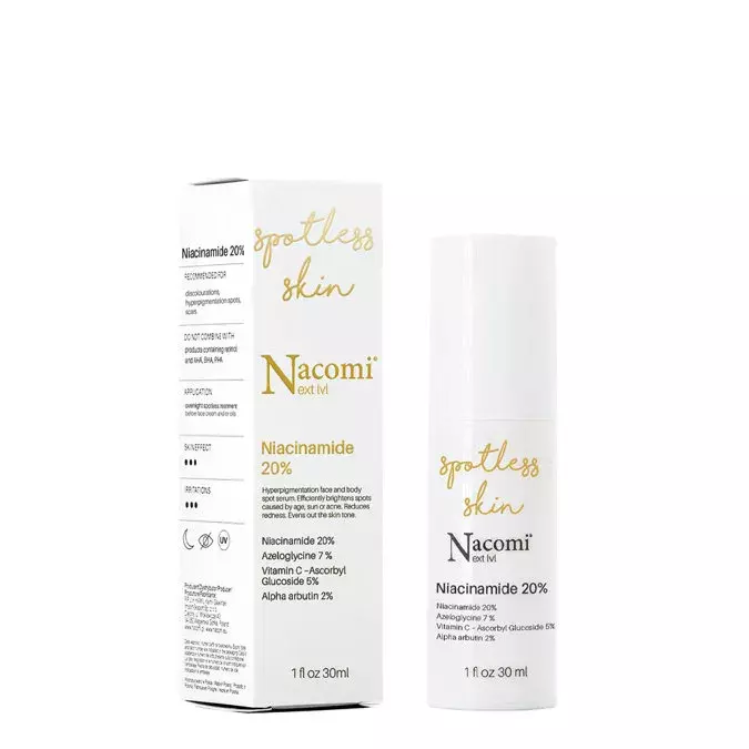 Nacomi - Next Level - Niacinamide 20% - Punktowe Serum Rozjaśniające z 20% Niacynamidem - preparat do punktowego stosowania na przebarwienia. Dzięki zawartości niacynamidu, witaminy C, azeloglicyny i alfa-arbutyny wspomaga walkę z przebarwieniami różnego pochodzenia, rozjaśniając je i zapobiegając ich powstawaniu. Serum zostało wzbogacone o nawilżającą trehalozę oraz kwas hialuronowy, co usprawnia regenerację zmienionej skóry. Produkt wyrównuje koloryt, działa przeciwzmarszczkowo, a także przyspiesza gojenie się skóry dzięki właściwościom przeciwzapalnym. Cała receptura została skomponowana z surowców pochodzenia naturalnego.
