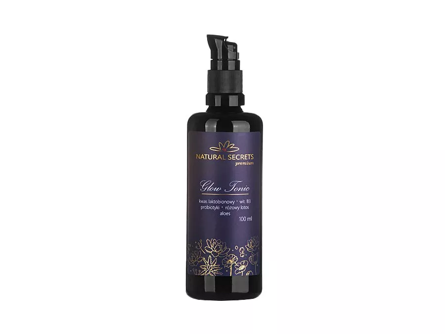 Natural Secrets - Glow Tonic - Tonizująca Kuracja Rozjaśniająca - preparat zawierający połączenie składników aktywnych z naturalnymi wyciągami roślinnymi, które wykazują silne właściwości przeciwzapalne, rozjaśniające i wygładzające. Produkt zawiera 10% stężenie kwasu laktobionowego oraz 3% niacynamidu (wit. B3), dzięki którym delikatnie rozjaśnia przebarwienia i reguluje pracę gruczołów łojowych. Wyciągi z różowego lotosu, wąkroty azjatyckiej oraz sok aloesowy działają łagodząco i dodatkowo rozświetlając skórę. Dzięki zawartości pantenolu i małocząsteczkowego kwasu hialuronowego cera staje się nawilżona i ukojona. Produkt zapakowany w szkło biofotonowe, które ochrania przed działaniem promieni słonecznych. Może być stosowany przez kobiety w ciąży i karmiące piersią.