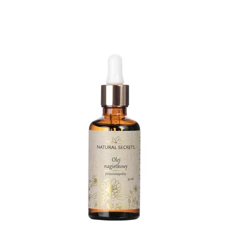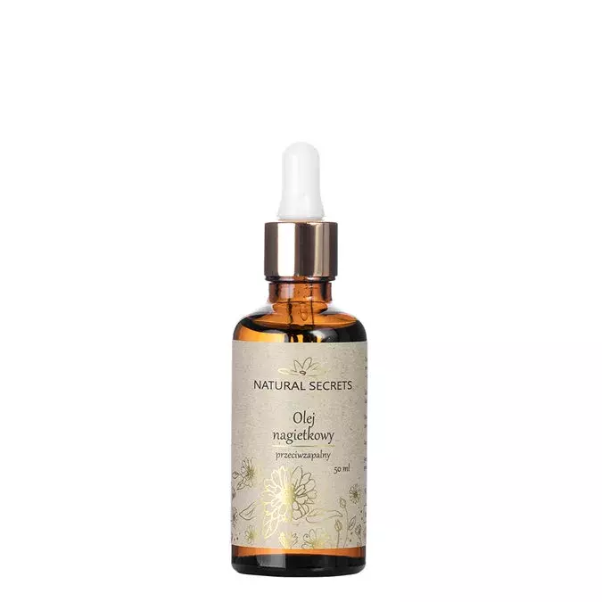 Natural Secrets - Olej Nagietkowy - otrzymany poprzez macerację kwiatów nagietka lekarskiego w oleju ze słodkich migdałów. Kwiaty nagietka wykazują silne właściwości przeciwzapalne i kojące, dzięki czemu świetnie sprawdzają się w pielęgnacji nawet bardzo wrażliwej i podrażnionej skóry. Organiczny olej ze słodkich migdałów działa ochronnie na naskórek, uelastycznia go i regeneruje.
