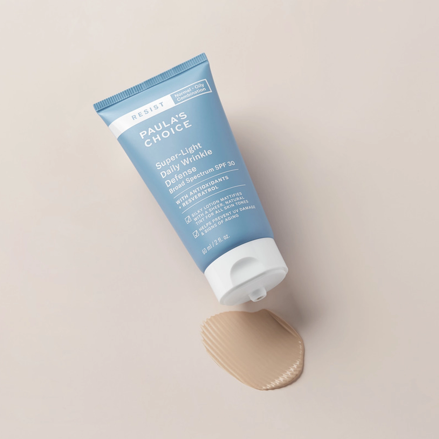 Paula's Choice - Resist - Super-Light Daily Wrinkle Defense SPF30 - krem zawiera filtr fizyczny (mineralny) - tlenek cynku, który chroni skórę przed szkodliwym wpływem promieniowania słonecznego. Dzięki zawartości pigmentu produkt delikatnie wyrównuje koloryt skóry. Lekka konsystencja produktu sprawia, że dobrze sprawdza się samodzielnie jak i pod makijaż. Pozostawia matowe wykończenie. Produkt został wzbogacony licznymi antyoksydantami takimi jak: resweratrol, witamina C czy ekstrakt z granatu, które zapobiegają przedwczesnemu starzeniu się skóry poprzez neutralizację wolnych rodników. Zawarta adenozyna będzie minimalizowała widoczność zmarszczek, a bisabolol będzie działał przeciwzapalnie i łagodząco.