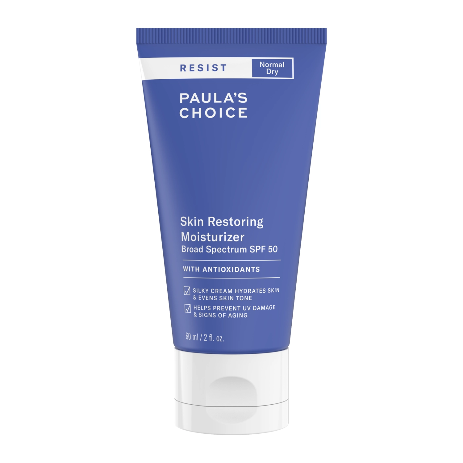 Paula's Choice - Resist - Skin Restoring Moisturizer SPF50 - krem nawilżający z filtrem przeciwsłonecznym SPF 50. Oprócz filtrów chemicznych, które chronią skórę przed promieniowaniem słonecznym, krem został wzbogacony o alantoinę i sok z aloesu, które będą działać łagodząco i kojąco. A także przeciwutleniacze takie jak: ekstrakt z jabłka, ekstrakt z mahoni pospolitej, ekstrakt z lukrecji, które będą chronić skórę przed szkodliwym działaniem czynników środowiskowych. Posiada kremowo-mleczną konsystencję.