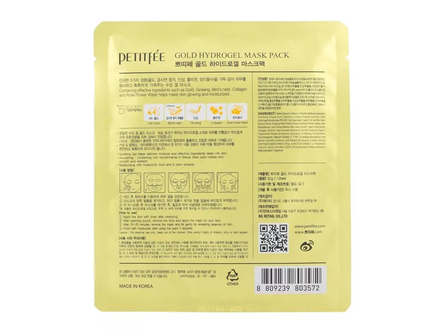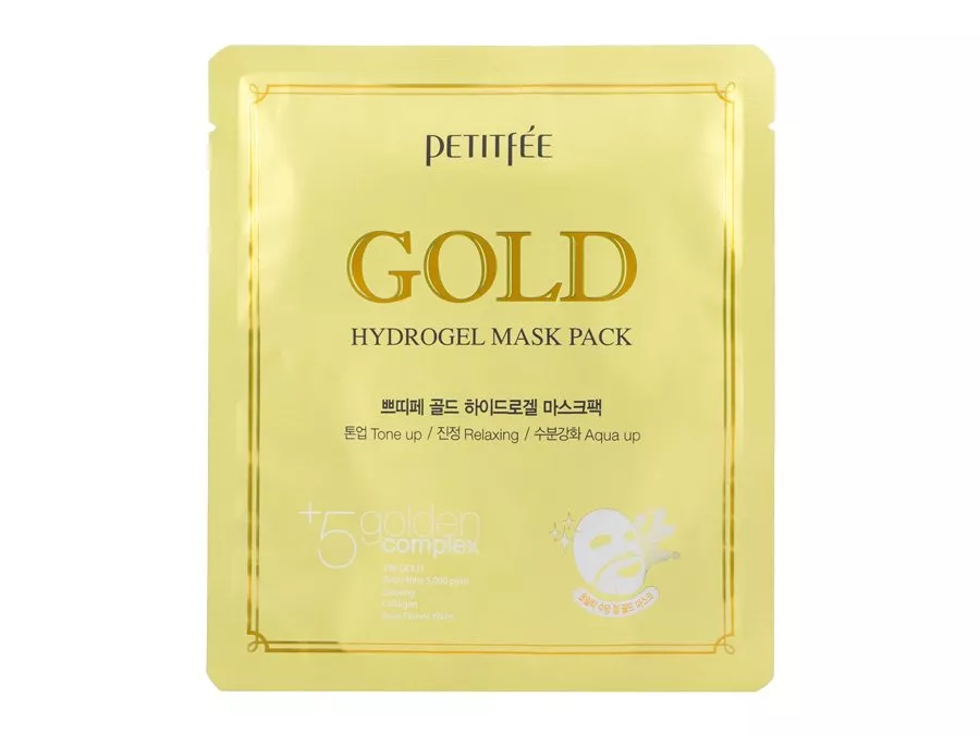 Petitfee - Gold Hydrogel Mask Pack - hydrożelowa maska na twarz w postaci dwuczęściowego płatu o silnym działaniu nawilżającym. Zawarty w esencji ekstrakt z gniazda Collocalini odżywia i działa rewitalizująco. Hialuronian sodu zwiększa nawilżenie skóry, a olej awokado dba o to, aby zatrzymać wodę w naskórku jak najdłużej. Zawarty wyciąg z żeń-szenia jest silnym antyoksydantem, dzięki czemu wzmacnia, wspomaga regenerację skóry i poprawia jej ukrwienie, a ekstrakt z liści zielonej herbaty wspomaga działanie przeciwrodnikowe i łagodzi podrażnienia.