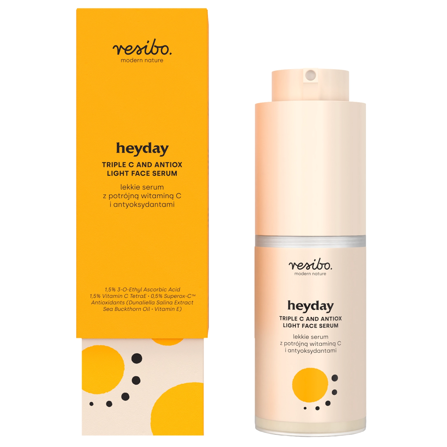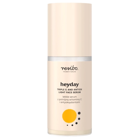 Resibo - Heyday - lekkie serum o orzeźwiającym zapachu pomarańczy. Jego wielowymiarowe działanie sprawdzi się w pielęgnacji każdego rodzaju skóry. W składzie znajduje się witamina C w formach Ascorbyl Tetraisopalmitate oraz 3-O-Ethyl Ascorbic Acid. Dodatkowym, trzecim źródłem witaminy C jest ekstrakt ze śliwki kakadu. Dzięki temu serum ma silne działanie antyoksydacyjne, dodatkowo poprzez stymulację kolagenu i elastyny działa przeciwstarzeniowo. Wyrównuje koloryt skóry i rozjaśnia przebarwienia. Dodatek trehalozy i oleju z nasion bawełny ogranicza utratę wody z naskórka, a olej jojoba wspomaga regenerację i poprawia elastyczność skóry. Serum wspiera naturalne procesy odnowy skóry i chroni przed działaniem wolnych rodników. Formuła produktu jest wegańska i zawiera 97,1% składników pochodzenia naturalnego.