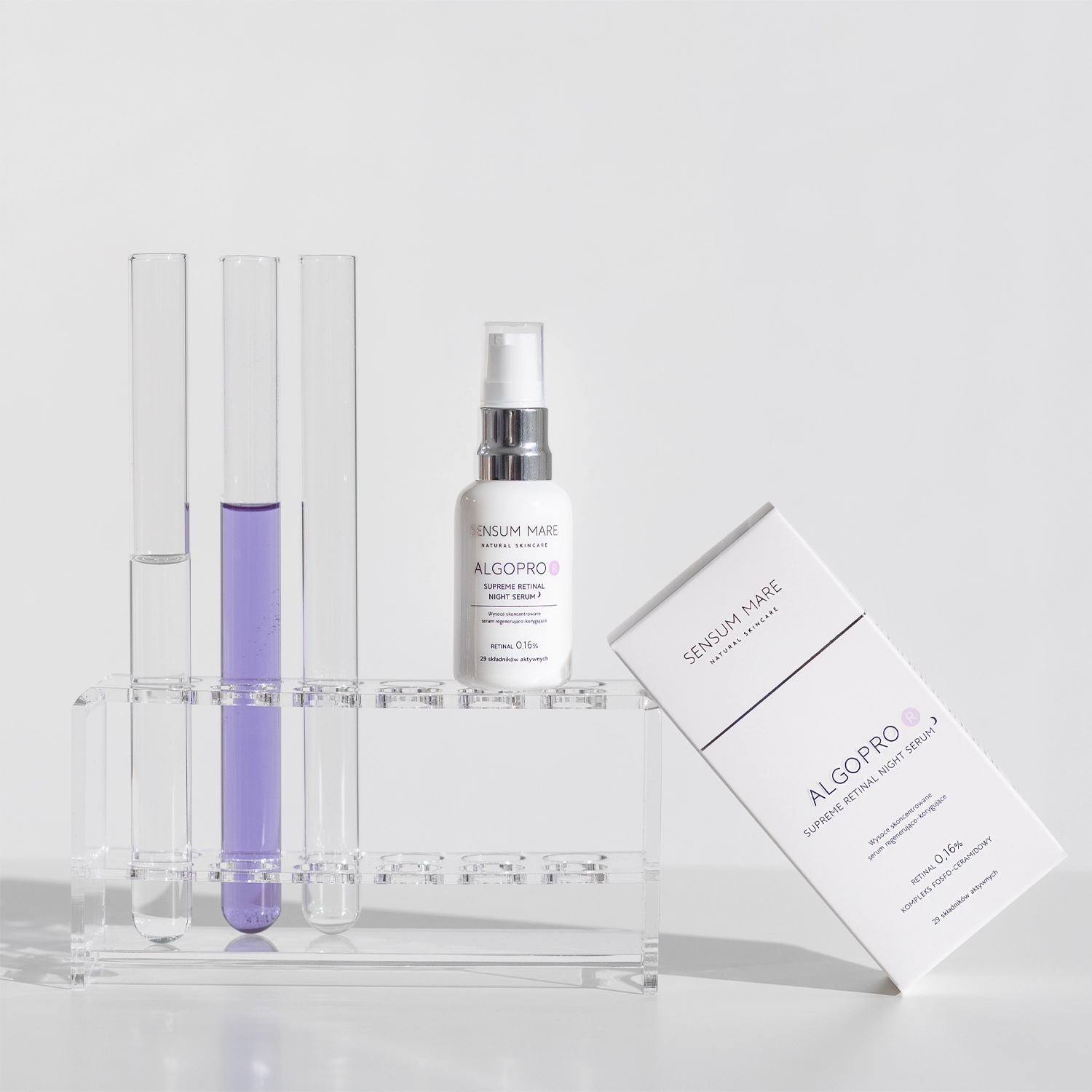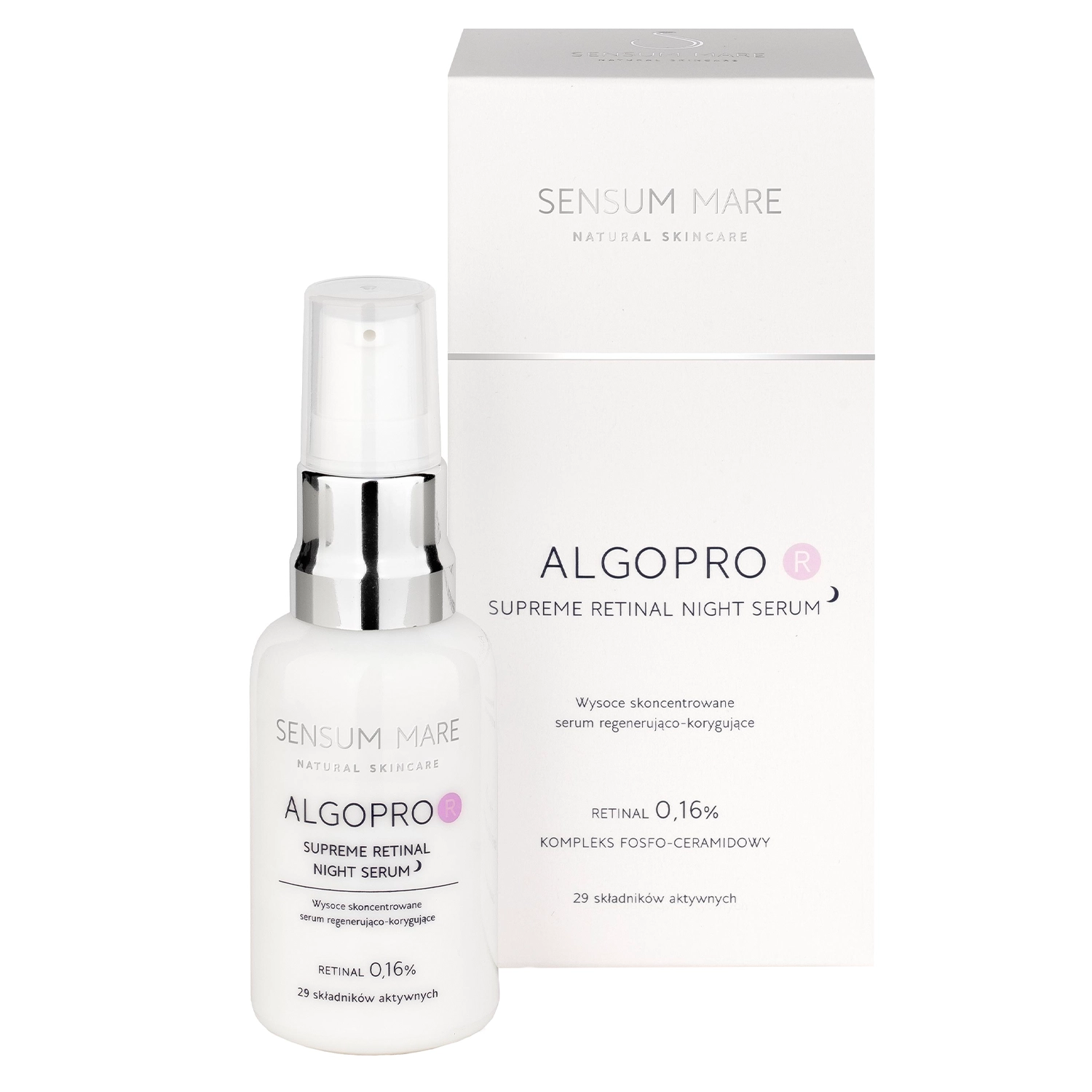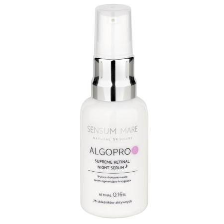 Sensum Mare - Algopro R - Serum z Retinalem 0,16% i Kompleksem Fosfo-Ceramidowym - wysoce skoncentrowane serum przeznaczone do wieczornej pielęgnacji. W formule zawarto 0,16% retinal, który działa wygładzająco i ujędrniająco. Składnik ten wykazuje wielopoziomowe działanie, między innymi zmniejsza widoczność zmarszczek, redukuje wypryski i rozjaśnia przebarwienia. Kompleks fosfo-ceramidowy powstały z połączenia fosfolipidów z ceramidami wspiera prawidłowe funkcjonowanie bariery hydrolipidowej. Z kolei trehaloza wraz z kompleksem alg morskich dbają o dostarczenie głębokiej dawki nawilżenia. Prebiotyk przywraca balans mikrobiomu, dodatkowo łagodząc podrażnienia. Kosmetyk nie jest zalecany do stosowania przez kobiety w ciąży i karmiące piersią. Produkt wegański, zawiera 96,91% składników pochodzenia naturalnego.