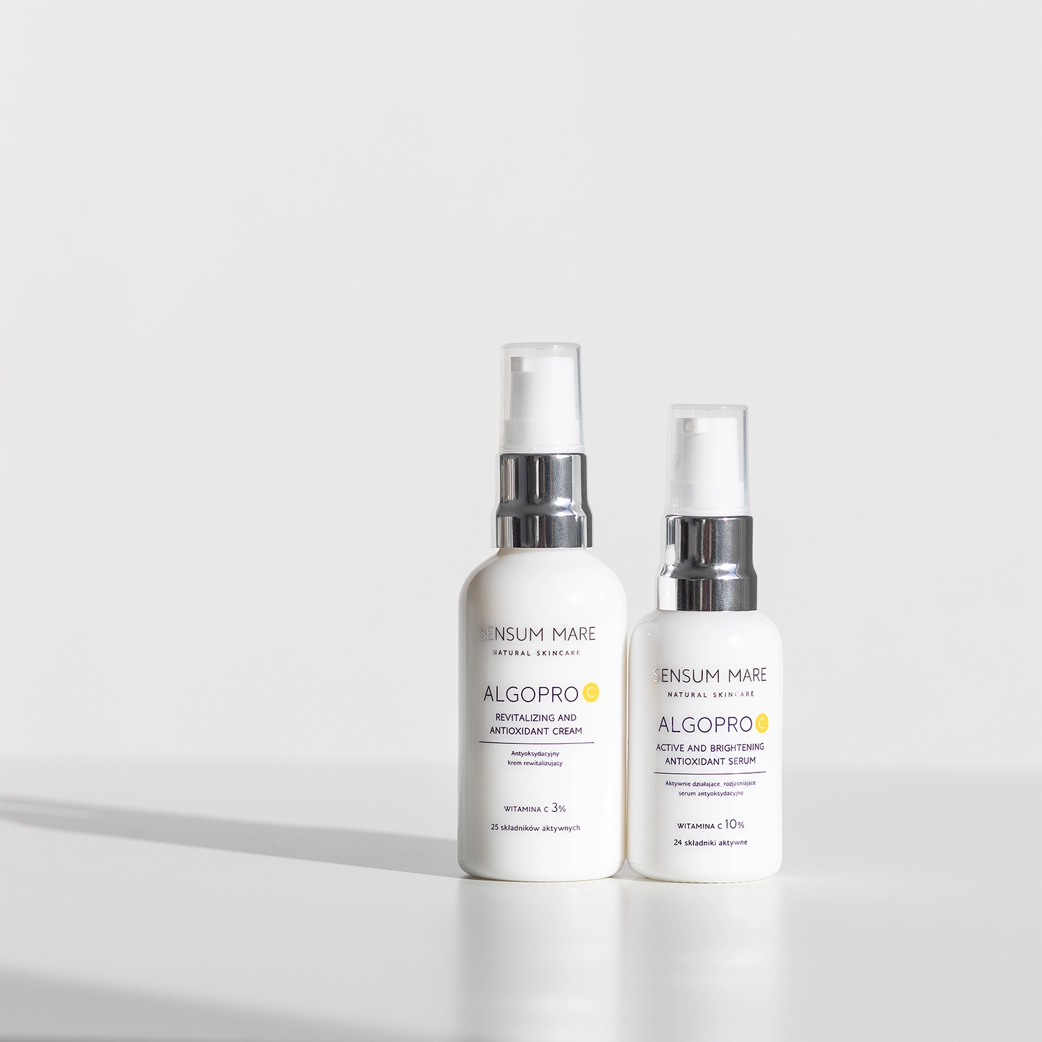 Sensum Mare - Algopro C - Aktywnie Działające, Rozjaśniające Serum Antyoksydacyjne z Witaminą C 10% - serum do twarzy z witaminą C w dwóch formach, która skutecznie rozjaśnia przebarwienia, wyrównując tym samym koloryt cery oraz działa przeciwstarzeniowo. Co więcej, zawarty w składzie niacynamid zwalcza niedoskonałości, luminescyna nadaje cerze rozświetlenia i wygładzenia, a kompleks 5 alg morskich zapewnia jej nawilżenie. Produkt powstał z 91,87% składników pochodzenia naturalnego i jest odpowiedni dla wegan.