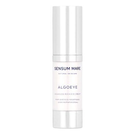 Sensum Mare - Algoeye - Advanced And Rich Eye Cream - krem pod oczy o zaawansowanej formule opartej na 18 składnikach aktywnych, które dogłębnie nawilżają oraz niwelują oznaki zmęczenia. Krem zawiera wodę z lodowca norweskiego, która jest cennym składnikiem minerałów, a także kompleks siedmiu rodzajów alg morskich, który nawilża i chroni skórę przed działaniem wolnych rodników. Opatentowany składnik Aldavine™5X w połączeniu z niacynamidem minimalizuje widoczność cieni pod oczami, a Corneosticker wygładza strukturę i koloryt okolic oczu. Kofeina zawarta w kremie poprawia mikrokrążenie, co wpływa na redukcję obrzęków i oznak zmęczenia, a oleje roślinne wzmacniają barierę ochronną i poprawiają elastyczność skóry. Formuła produktu jest wegańska.