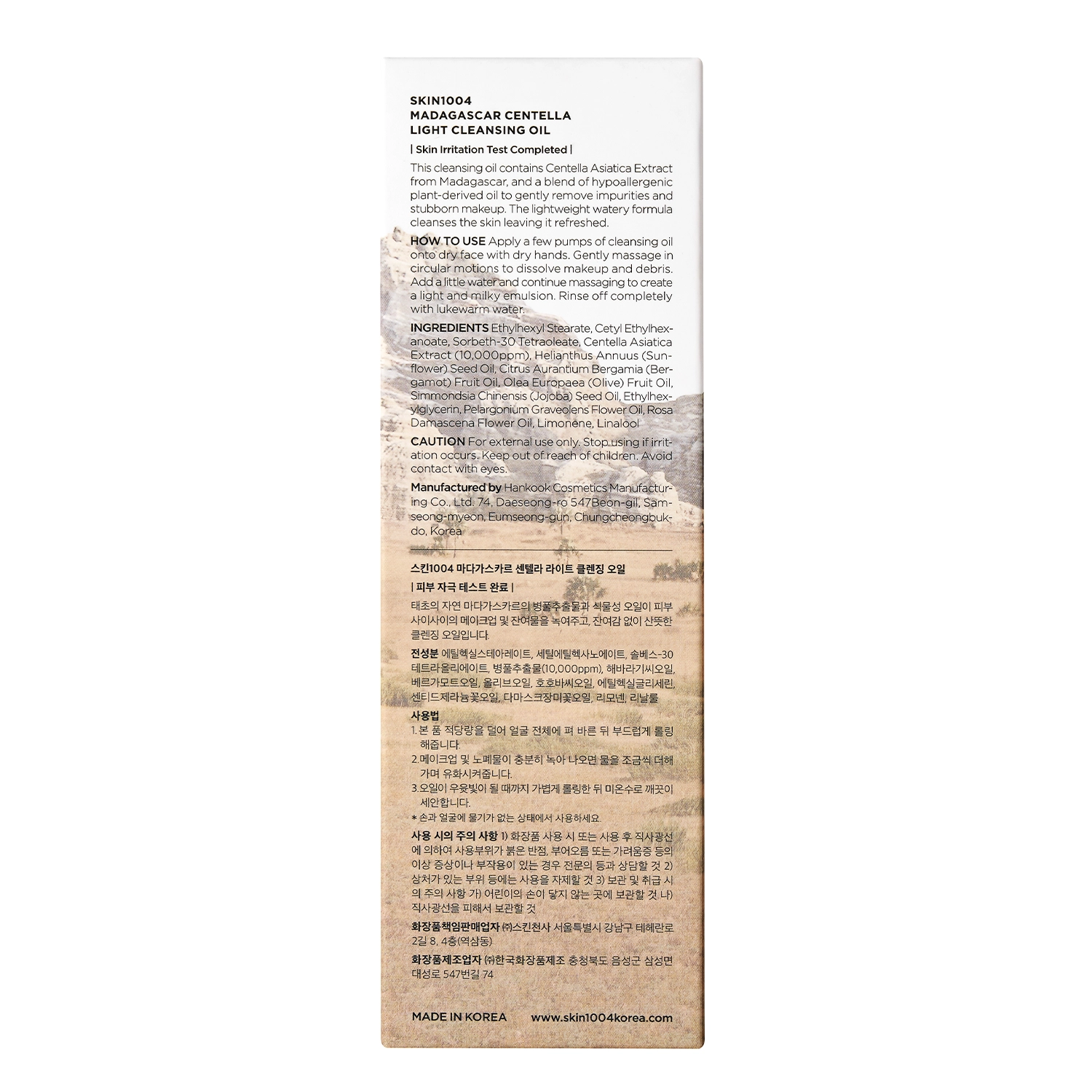 SKIN1004 - Madagascar Centella Light Cleansing Oil - olejek do demakijażu, odpowiedni dla każdego rodzaju skóry. Skutecznie usuwa makijaż, również oczu, oczyszcza z pozostałości sebum i kremu z filtrem, w pierwszym etapie mycia skóry. Bazą produktu jest mieszanka olejów, takich jak olej słonecznikowy, olej jojoba i oliwa z oliwek. Wspólnie rozpuszczają zanieczyszczenia i ułatwiają masowanie skóry podczas demakijażu. Dodatkowo formuła olejku zawiera łagodzący i przeciwzapalny ekstrakt z wąkroty azjatyckiej. Całość dopełnia olejek z bergamotki i różany, które wspierają zmniejszanie stanów zapalnych i nadają produktowi przyjemny zapach. Olejek do demakijażu dzięki obecności emulgatora w składzie po kontakcie z wodą zaczyna emulgować, co ułatwia jego zmycie. Produkt w wersji mini, która świetnie sprawdzi się na wyjeździe.