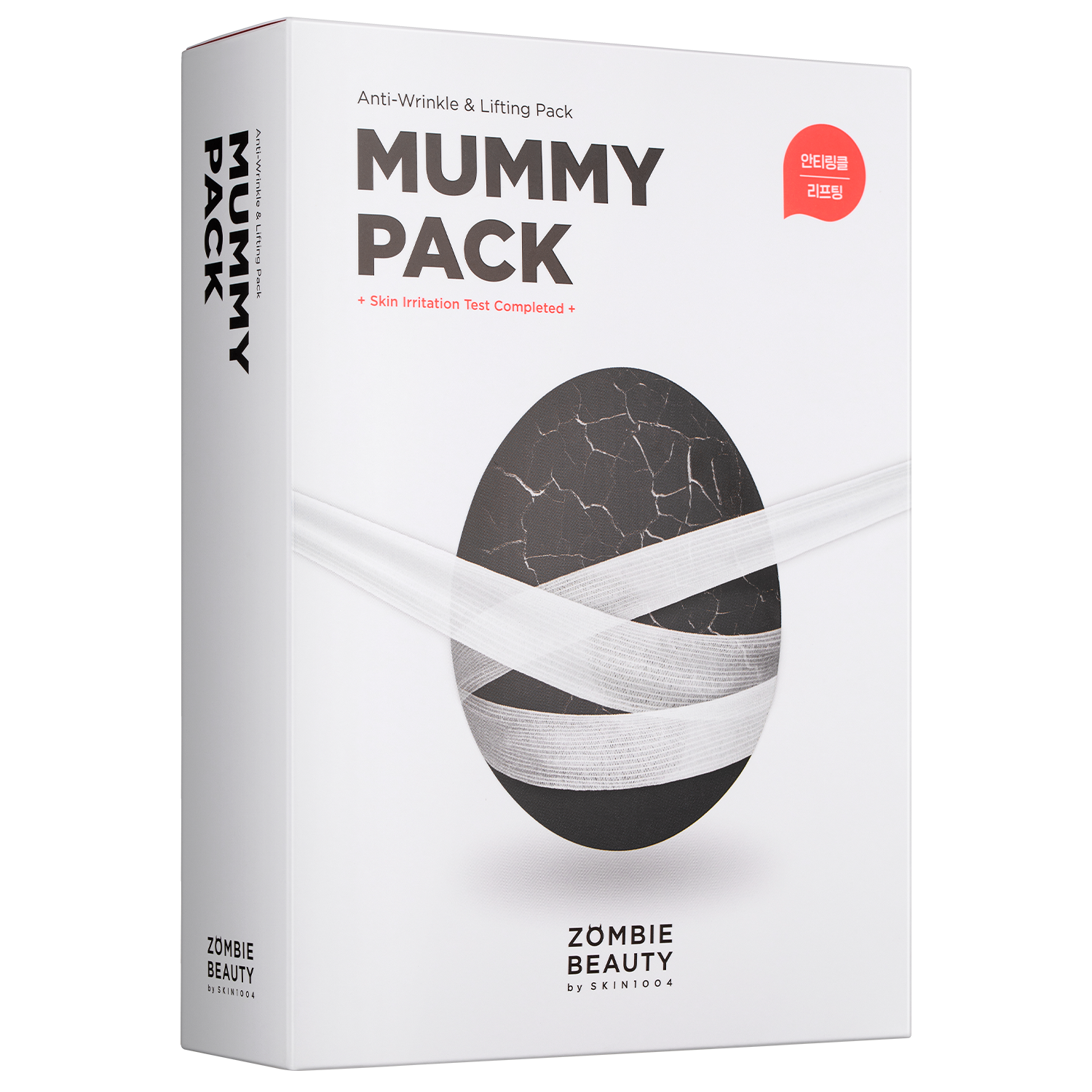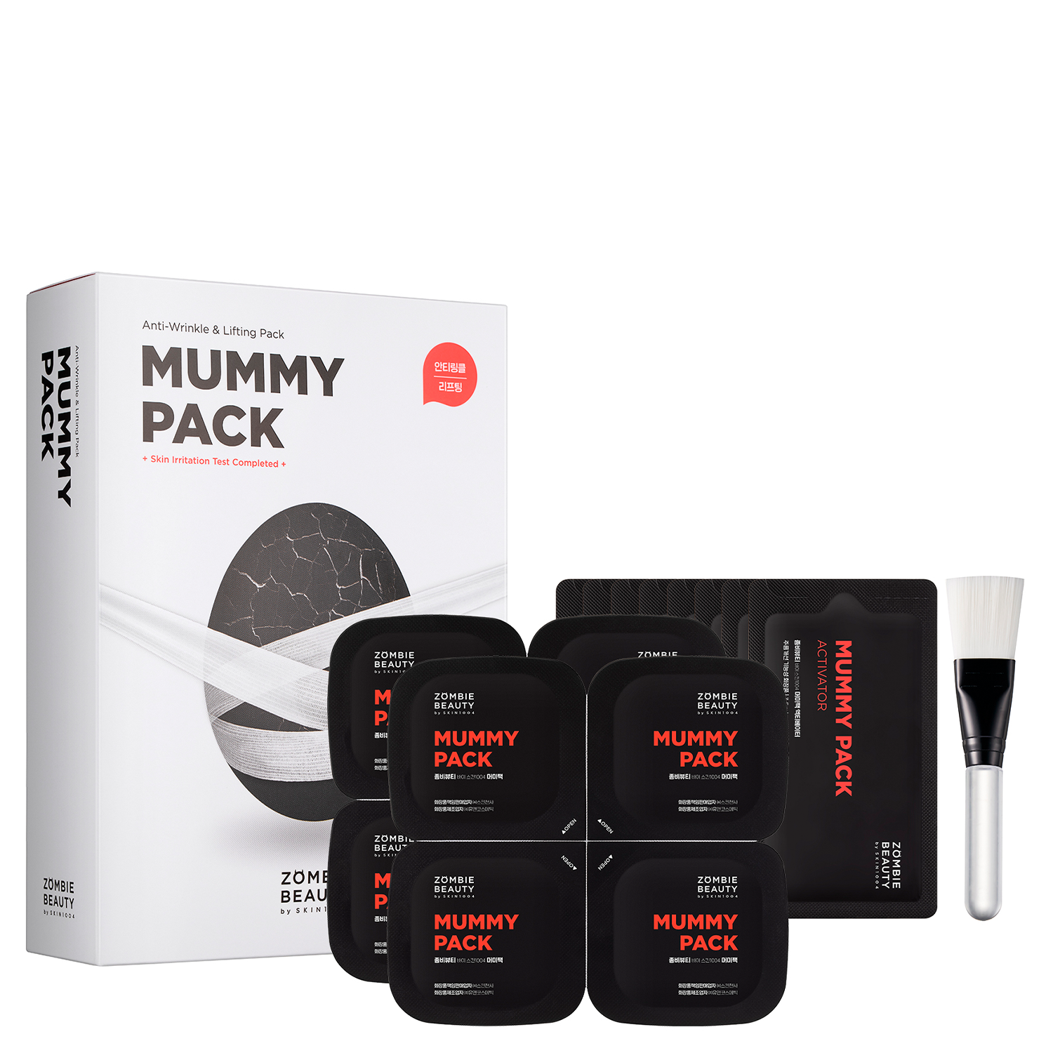 ZOMBIE BEAUTY by SKIN1004 Mummy Pack & Activator Kit - Przeciwzmarszczkowy i Liftingujący Zestaw Masek do Twarzy - zestaw maseczek do twarzy o działaniu napinającym. W jego skład wchodzi płynny aktywator oraz proszek, które należy ze sobą połączyć za pomocą dołączonego pędzla. Produkt zawiera ujędrniającą albuminę oraz ekstrakt z trufli, który stymuluje powstawanie włókien kolagenu i elastyny. Oprócz działania liftingującego, maseczka redukuje widoczność porów. Węgiel aktywny dba o oczyszczenie skóry, a niacynamid zmniejsza ujścia gruczołów łojowych i łagodzi. Po zastosowaniu twarz staje się ujędrniona i napięta, a jej owal uniesiony.