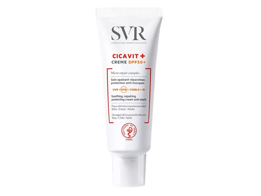 SVR - Cicavit+ Creme SPF50+ - hipoalergiczny krem oparty na formule przyspieszającej regenerację skóry, jednocześnie chroniąc ją przed szkodliwym działaniem promieni słonecznych. Nawilża i przeciwdziała ściągnięciu skóry podczas procesu gojenia. Za sprawą filtrów UVA i UVB zapewnia bardzo wysoką ochronę przed promieni: UVB, UVB, VIS, IR. Dla osób ze skórą wrażliwą, uszkodzoną, eksponowaną na działanie promieni słonecznych: otarcia, pęknięcia, spierzchnięcia, podrażnienia, świeże blizny, po zabiegach dermatologicznych (lasery, peelingi) lub chirurgicznych, po wykonaniu tatuażu. Odpowiedni dla dzieci od pierwszego dnia życia oraz dorosłych.
