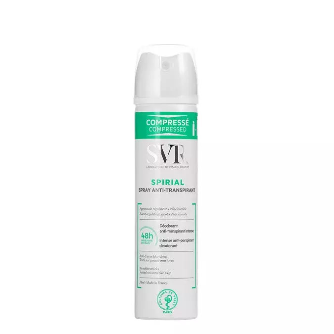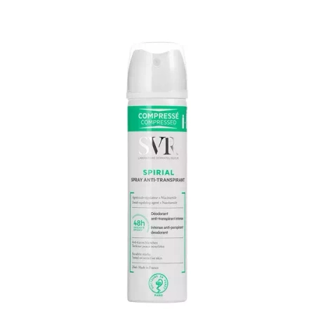 SVR - Spiral Spray Anti-Transpirant - antyperspirant zapewniający długotrwałą ochronę przed potem i nieprzyjemnym zapachem. Dodatek ekstraktu z bambusa i ekstraktu ze skrzypu polnego działają antybakteryjnie i przeciwzapalnie, a olej abisyński łagodzi i wygładza skórę. Produkt nie pozostawia białych śladów na ubraniu.