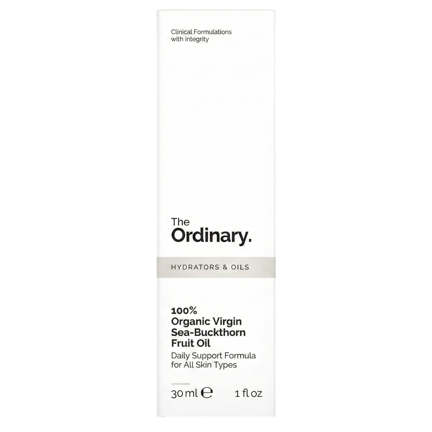 The Ordinary - 100% Organic Virgin Sea-Buckthorn Fruit Oil - 100% czysty olej z owoców z rokitnika, nierafinowany, pozyskiwany w sposób ekologiczny. Zawiera wysokie stężenie kwasu palmitynowego (Omega 7), który odżywia i chroni skórę. Produkt szybko się wchłania. Rekomendowany do każdego typu skóry, zwłaszcza dla cery wrażliwej i odwodnionej. Kosmetyk nie zawiera wody, silikonu oraz alkoholu. Jest to produkt bezglutenowy i wegański, a podczas jego produkcji nie ucierpiały żadne zwierzęta.