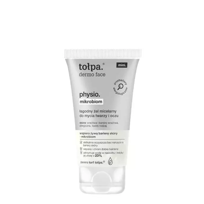 Tołpa - Dermo Face Physio Mikrobiom - Łagodny Żel Micelarny do Mycia Twarzy i Oczu - Mini - kosmetyk do demakijażu twarzy i oczu w formie żelu. Zawiera łagodne substancje myjące, które pozwalają oczyścić skórę. Dodatkowo probiotyk Bifida Ferment Lysate sprzyja utrzymywaniu prawidłowego mikrobiomu na powierzchni skóry. Cenny wyciąg z torfowca działa oczyszczająco, odświeżająco i detoksykująco oraz niweluje wolne rodniki, a hialuronian sodu poprawia nawilżenie skóry.