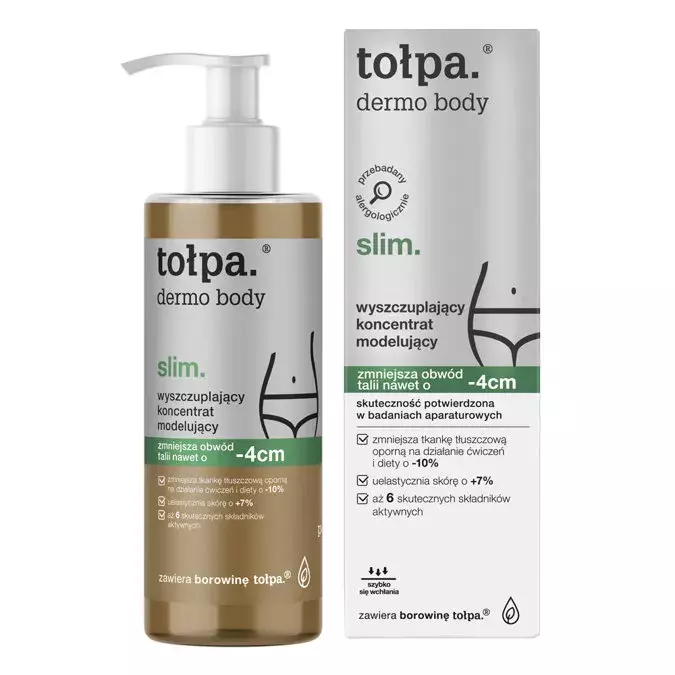 Tołpa - Dermo Body Slim - Wyszczuplający Koncentrat Modelujący - koncentrat o działaniu redukującym tkankę tłuszczową oraz liftingującym wiotką skórę. Zawiera borowinę tołpa.® o działaniu ujędrniającym i antycellulitowym, ekstrakt z kwiatów czarnego bzu, który regeneruje i napina skórę, a także ekstrakt z kawy o działaniu antyoksydacyjnym i przeciwstarzeniowym. Co więcej, został wzbogacony o ekstrakt z nasion pieprzowca brazylijskiego odpowiedzialnego za pobudzenie mikrokrążenia w skórze i wzmożenie działania antycellulitowego.