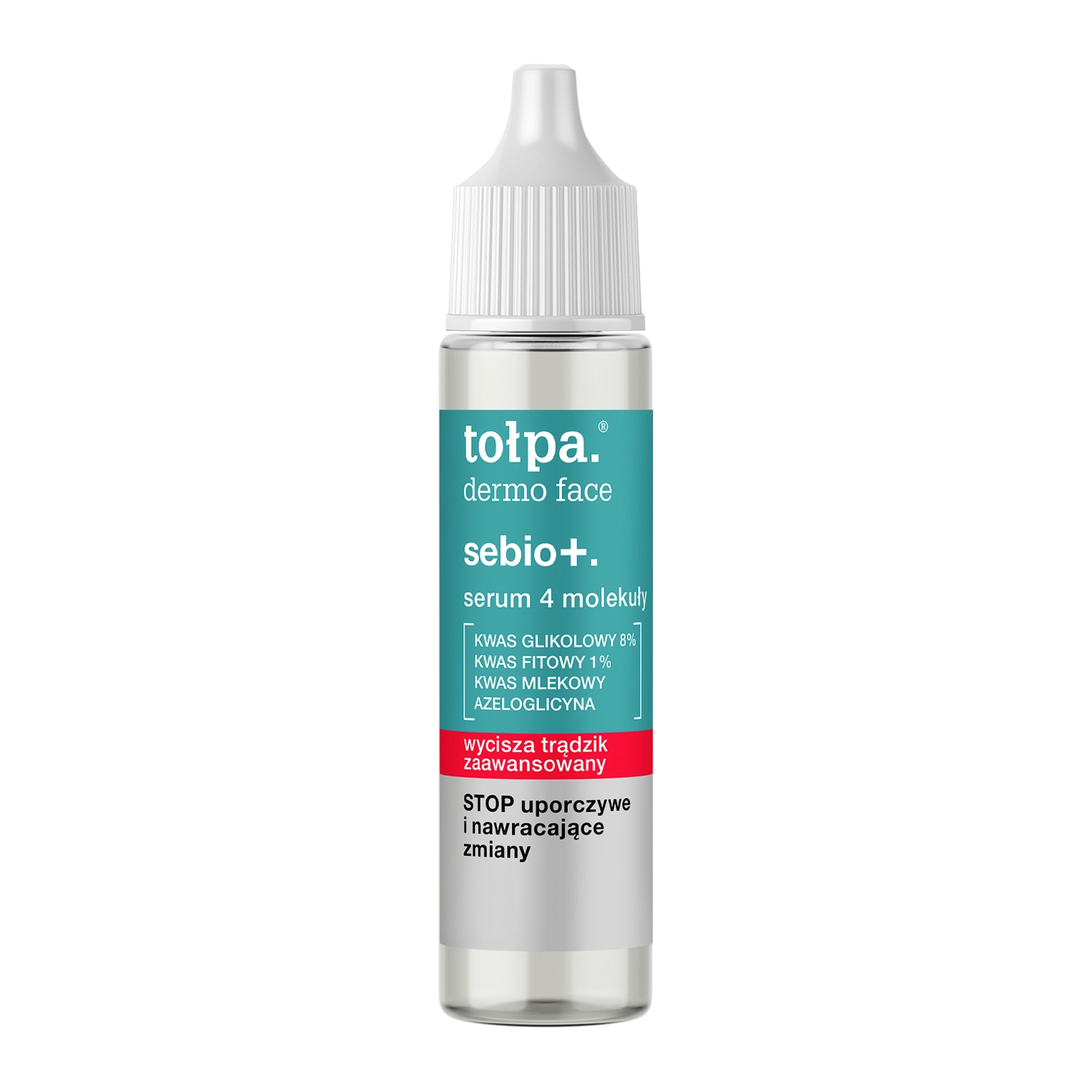 Tołpa - Dermo Face Sebio+ - Serum 4 Molekuły - wycisza niedoskonałości i wspiera walkę z przebarwieniami. Zawiera kwas glikolowy w stężeniu 8%, który działa złuszczająco, seboregulująco i rozjaśniająco. Z kolei kwas fitowy spowalnia procesy starzenia się skóry, poprawia poziom nawilżenia oraz skutecznie rozjaśnia przebarwienia i zapobiega powstawaniu nowych. Kwas mlekowy zmiękcza i głęboko nawilża. Dodatek azeloglicyny działa przeciwzapalnie i rozjaśniająco, a także przyspiesza regenerację skóry.