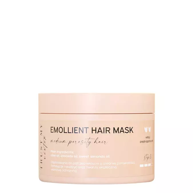 Trust My Sister - Emollient Hair Mask - Emolientowa Maska do Włosów Średnioporowatych - emolientowa maska do włosów o średniej porowatości. Zawiera oleje makadamia, z awokado i ze słodkich migdałów, które odżywiają włosy i sprawiają, że są gładkie, miękkie, błyszczące, elastyczne, a także mniej podatne na przesuszenie, puszenie czy uszkodzenia. Polecana szczególnie do matowych, szorstkich w dotyku włosów, które szybko się niszczą czy przesuszają.