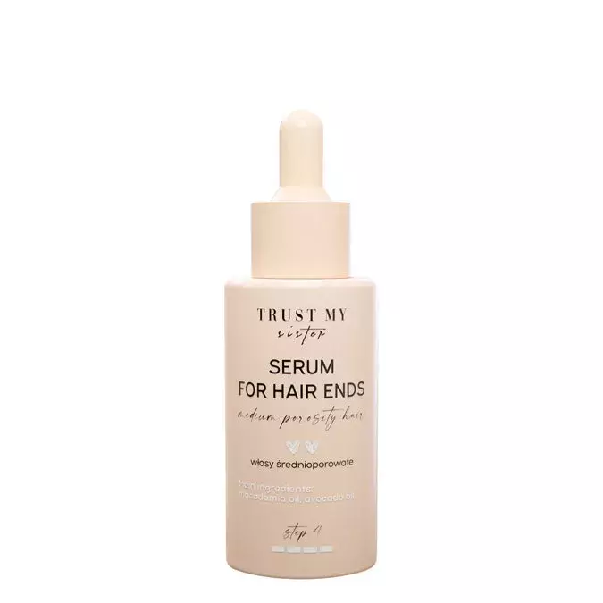 Trust My Sister - Serum for Hair Ends - Serum do Włosów Średnioporowatych - silikonowo-olejowe serum do włosów o średniej porowatości. Zawiera silikony, które tworzą na włosach film chroniący je przed uszkodzeniami i przesuszeniem oraz sprawiają, że włosy są gładkie i elastyczne. Dodatkowo oleje makadamia, z awokado, ze słodkich migdałów działają kondycjonująco, zmiękczająco i wygładzajaco, utrzymują nawilżenie we włosach oraz dodają blasku. Produkt świetnie sprawdzi się do wygładzania i zabezpieczania końcówek włosów po myciu.