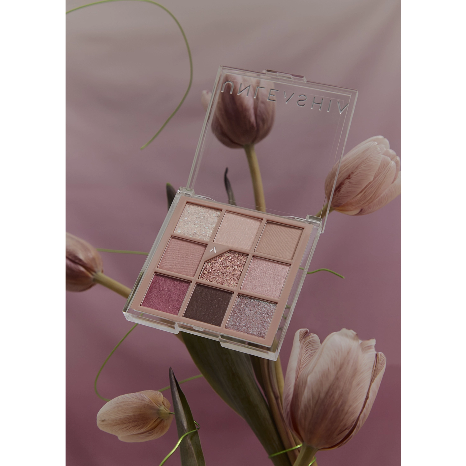 - Paleta 9 matowych i brokatowych cieni w różanej kolorystyce