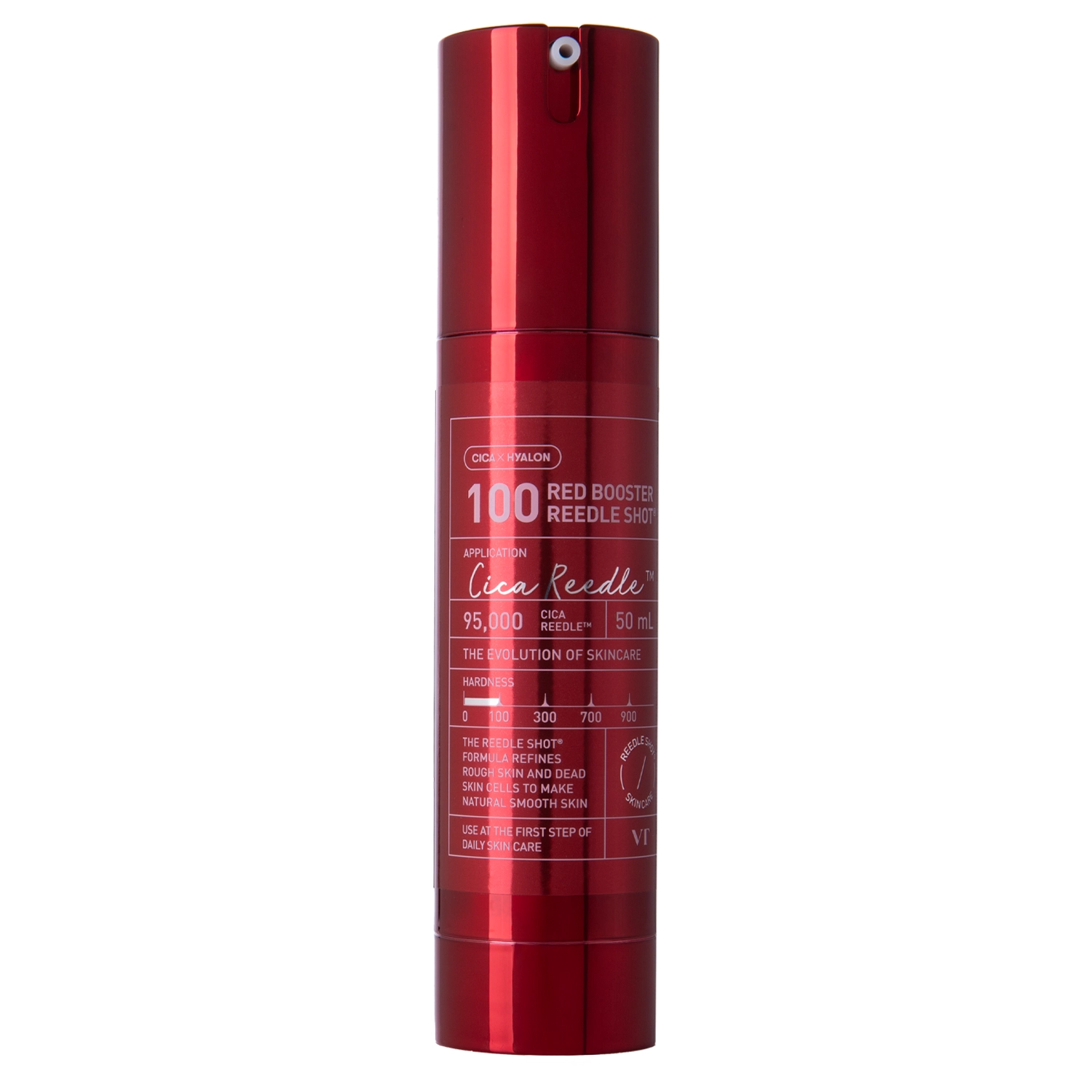 VT Cosmetics - Red Booster Reedle Shot 100 - serum z mikroigłami. Formuła Cica Reedle™ składająca się z mikroskopijnych cząsteczek pochodzenia mineralnego wspomaga wchłanianie składników aktywnych i jednocześnie złuszcza martwe komórki naskórka. Regularnie stosowana zapewnia gładszą i bardziej promienną skórę. Obecna w recepturze wąkrota azjatycka i składniki z niej wyizolowane: madekasozyd, kwas madekasowy, azjatykozyd i kwas azjatykowy aktywnie wspomagają naturalne procesy odnowy skóry. Dodatek hialuronianu sodu wyraźnie wygładza skórę i utrzymuje nawilżenie na dłużej, a ekstrakt z propolisu odżywia i przyspiesza gojenie. Dzięki takiemu składowi produkt jest odpowiedni do wszystkich rodzajów skóry, w tym skóry wrażliwej i skłonnej do trądziku.